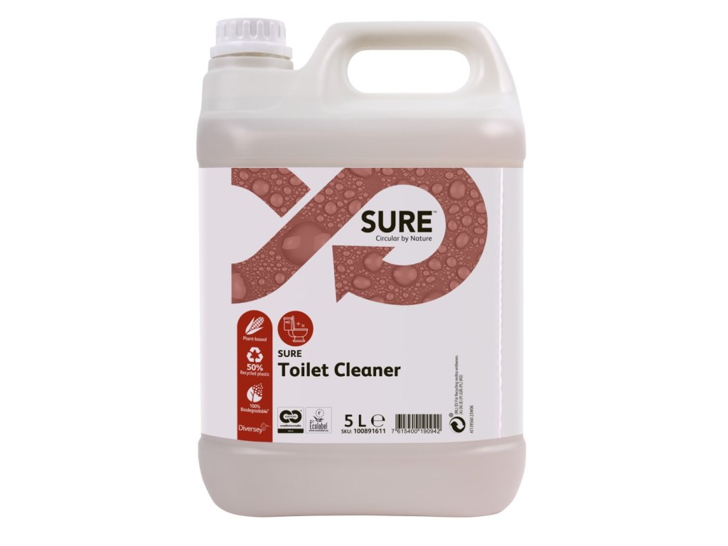 SURE čistič na WC (SURE Toilet Cleaner) je profesionální čisticí prostředek připravený k okamžitému použití pro denní údržbu toalet a pisoárů. Tento ekologický produkt je součástí unikátní řady SURE založené na rostlinné bázi a je 100 % biologicky odbouratelný, což zajišťuje efektivní čištění s minimálním dopadem na životní prostředí. SURE Toilet Cleaner je vhodný pro firmy i domácnosti, které chtějí rychle a bezpečně odstranit vodní kámen a usazeniny i z těžko přístupných míst.