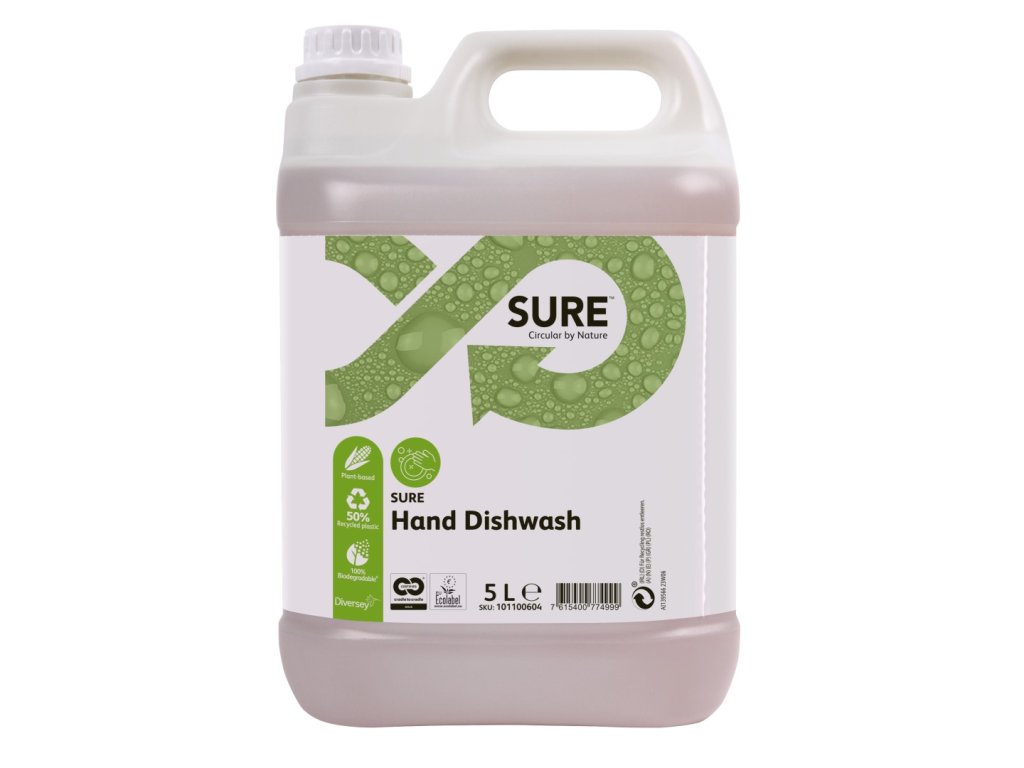 SURE Hand Dishwash je profesionální koncentrovaný čisticí prostředek určený pro ruční mytí hrnců, pánví, skla a veškerého omyvatelného nádobí. Produkt je součástí unikátní řady SURE založené na rostlinné bázi a je 100 % biologicky odbouratelný, což zajišťuje efektivní čištění s minimálním dopadem na životní prostředí. Ideální volba pro domácnosti i profesionální kuchyně, kde je důležitá účinnost, bezpečnost a ekologická šetrnost.