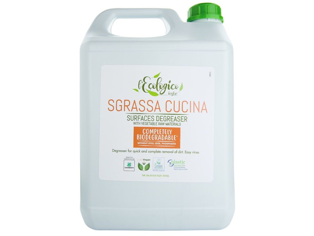 L’ECOLOGICO SGRASSA CUCINA 5 litrů je ekologický a vysoce účinný odmašťovací přípravek na bázi rostlinných tenzidů. Spolehlivě odstraňuje odolnou mastnotu a zbytky z kuchyňských a jiných omyvatelných povrchů. Je ideální pro úklid troub, grilů, digestoří, sporáků, obkladů, ale také pro předpírání mastného prádla.